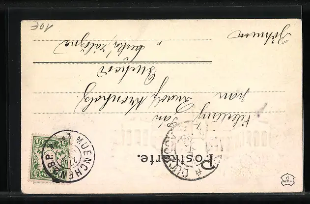 Personenbezogene Daten auf der Rückseite der Karte wurden durch blauen Textmarker unkenntlich gemacht. Die blauen Stellen sind auf die Vorderseite durchgeweicht und wirken sich negativ auf das Postkartenfoto aus