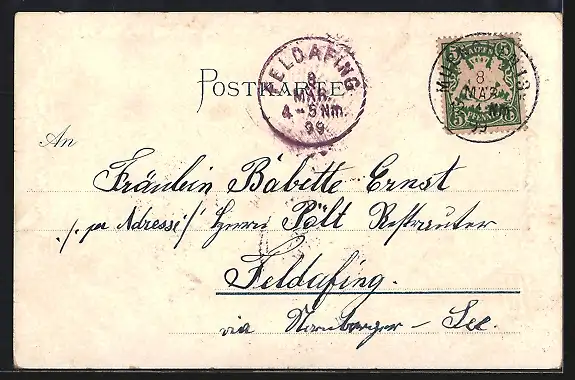 Personenbezogene Daten auf der Rückseite der Karte wurden durch blauen Textmarker unkenntlich gemacht. Die blauen Stellen sind auf die Vorderseite durchgeweicht und wirken sich negativ auf das Postkartenfoto aus