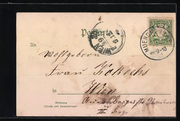 Personenbezogene Daten auf der Rückseite der Karte wurden durch blauen Textmarker unkenntlich gemacht. Die blauen Stellen sind auf die Vorderseite durchgeweicht und wirken sich negativ auf das Postkartenfoto aus