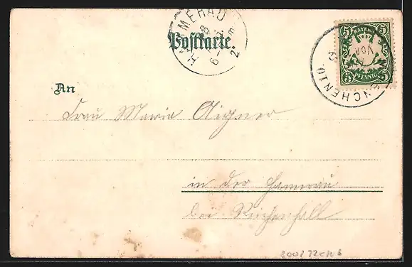 Personenbezogene Daten auf der Rückseite der Karte wurden durch blauen Textmarker unkenntlich gemacht. Die blauen Stellen sind auf die Vorderseite durchgeweicht und wirken sich negativ auf das Postkartenfoto aus