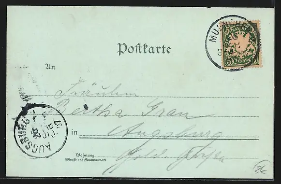 Personenbezogene Daten auf der Rückseite der Karte wurden durch blauen Textmarker unkenntlich gemacht. Die blauen Stellen sind auf die Vorderseite durchgeweicht und wirken sich negativ auf das Postkartenfoto aus