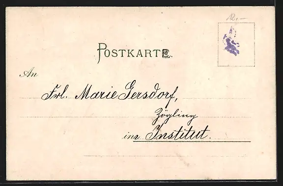 Personenbezogene Daten auf der Rückseite der Karte wurden durch blauen Textmarker unkenntlich gemacht. Die blauen Stellen sind auf die Vorderseite durchgeweicht und wirken sich negativ auf das Postkartenfoto aus