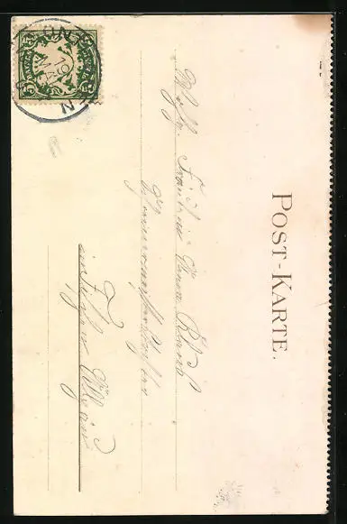Personenbezogene Daten auf der Rückseite der Karte wurden durch blauen Textmarker unkenntlich gemacht. Die blauen Stellen sind auf die Vorderseite durchgeweicht und wirken sich negativ auf das Postkartenfoto aus