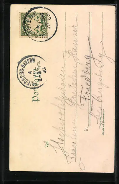 Personenbezogene Daten auf der Rückseite der Karte wurden durch blauen Textmarker unkenntlich gemacht. Die blauen Stellen sind auf die Vorderseite durchgeweicht und wirken sich negativ auf das Postkartenfoto aus