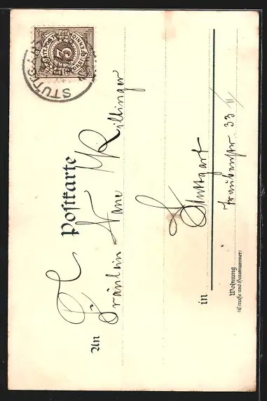 Personenbezogene Daten auf der Rückseite der Karte wurden durch blauen Textmarker unkenntlich gemacht. Die blauen Stellen sind auf die Vorderseite durchgeweicht und wirken sich negativ auf das Postkartenfoto aus
