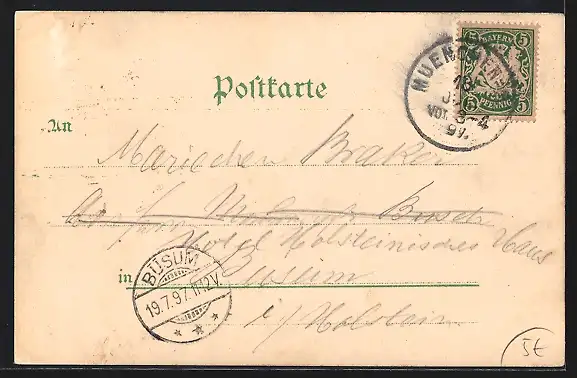Personenbezogene Daten auf der Rückseite der Karte wurden durch blauen Textmarker unkenntlich gemacht. Die blauen Stellen sind auf die Vorderseite durchgeweicht und wirken sich negativ auf das Postkartenfoto aus