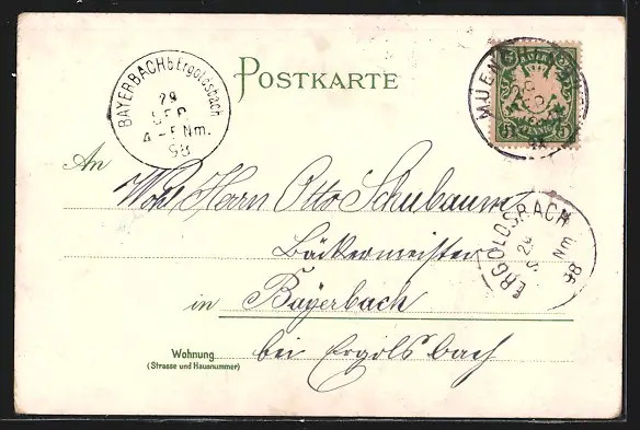 Personenbezogene Daten auf der Rückseite der Karte wurden durch blauen Textmarker unkenntlich gemacht. Die blauen Stellen sind auf die Vorderseite durchgeweicht und wirken sich negativ auf das Postkartenfoto aus