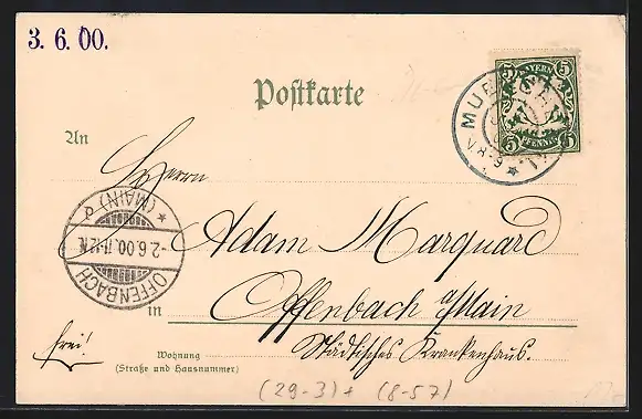 Personenbezogene Daten auf der Rückseite der Karte wurden durch blauen Textmarker unkenntlich gemacht. Die blauen Stellen sind auf die Vorderseite durchgeweicht und wirken sich negativ auf das Postkartenfoto aus