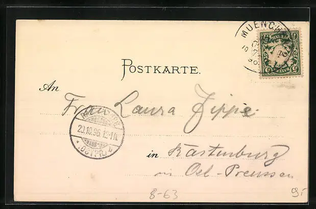 Personenbezogene Daten auf der Rückseite der Karte wurden durch blauen Textmarker unkenntlich gemacht. Die blauen Stellen sind auf die Vorderseite durchgeweicht und wirken sich negativ auf das Postkartenfoto aus