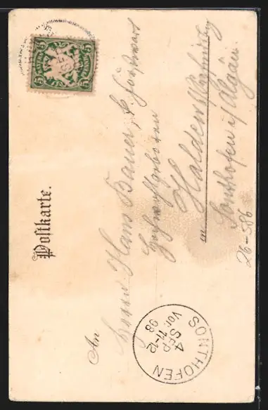 Personenbezogene Daten auf der Rückseite der Karte wurden durch blauen Textmarker unkenntlich gemacht. Die blauen Stellen sind auf die Vorderseite durchgeweicht und wirken sich negativ auf das Postkartenfoto aus