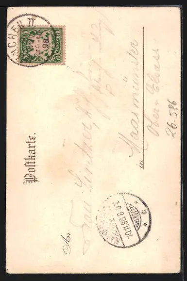 Personenbezogene Daten auf der Rückseite der Karte wurden durch blauen Textmarker unkenntlich gemacht. Die blauen Stellen sind auf die Vorderseite durchgeweicht und wirken sich negativ auf das Postkartenfoto aus