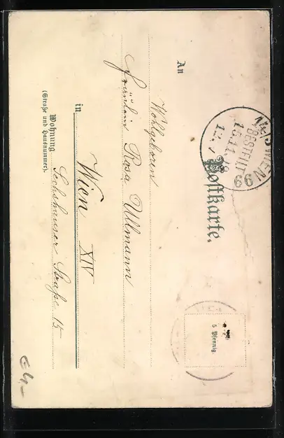 Personenbezogene Daten auf der Rückseite der Karte wurden durch blauen Textmarker unkenntlich gemacht. Die blauen Stellen sind auf die Vorderseite durchgeweicht und wirken sich negativ auf das Postkartenfoto aus