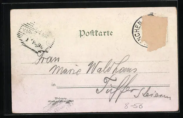 Personenbezogene Daten auf der Rückseite der Karte wurden durch blauen Textmarker unkenntlich gemacht. Die blauen Stellen sind auf die Vorderseite durchgeweicht und wirken sich negativ auf das Postkartenfoto aus