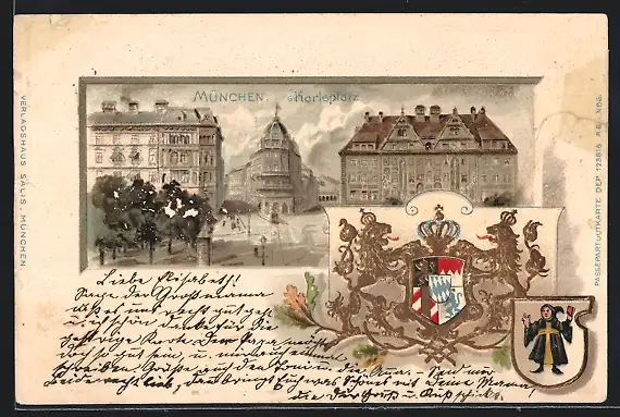Lithographie München, Karlsplatz, Wappen, Münchner Kindl