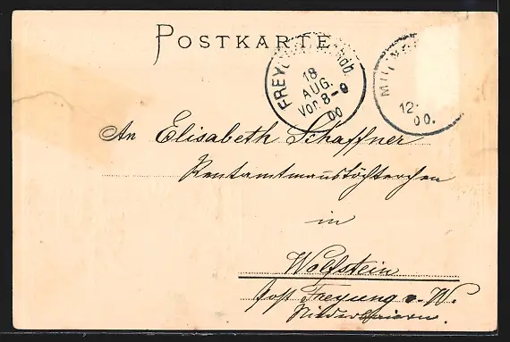 gelaufen 1900, geklebte Einrisse li., oben und re., Briefmarke entfernt, rückseitig Oberflächenschaden, guter Zustand