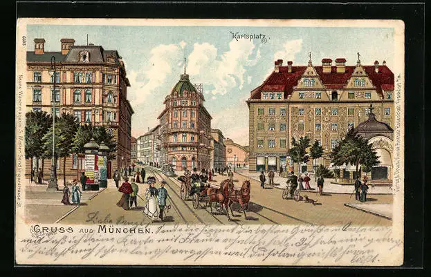 Lithographie München, Karlsplatz mit Kutsche und Strassenbahn