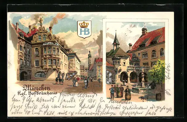 Lithographie München, Kgl. Hofbräuhaus, Aussen- und Innenansicht