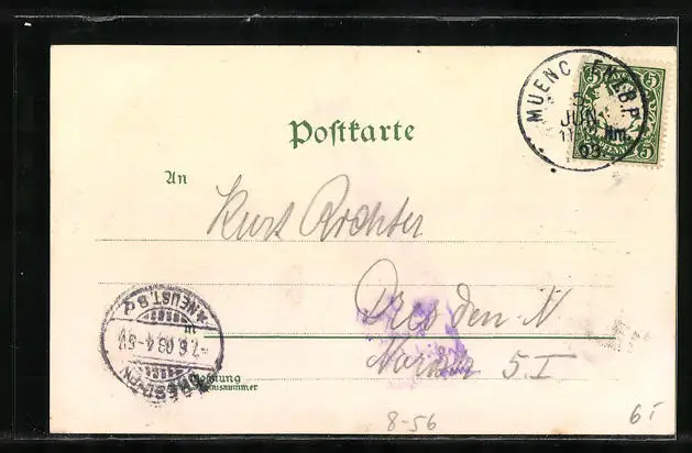 Personenbezogene Daten auf der Rückseite der Karte wurden durch blauen Textmarker unkenntlich gemacht. Die blauen Stellen sind auf die Vorderseite durchgeweicht und wirken sich negativ auf das Postkartenfoto aus