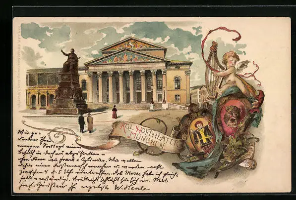 Lithographie München, Königliches Hoftheater mit Denkmal