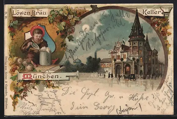 Lithographie München, Löwenbräu-Keller, Ach, nur koa Wasser net!
