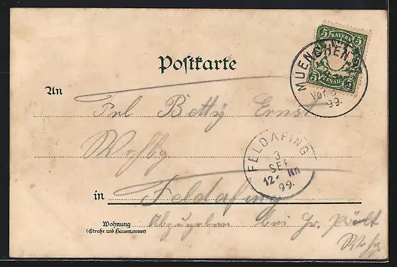 Personenbezogene Daten auf der Rückseite der Karte wurden durch blauen Textmarker unkenntlich gemacht. Die blauen Stellen sind auf die Vorderseite durchgeweicht und wirken sich negativ auf das Postkartenfoto aus
