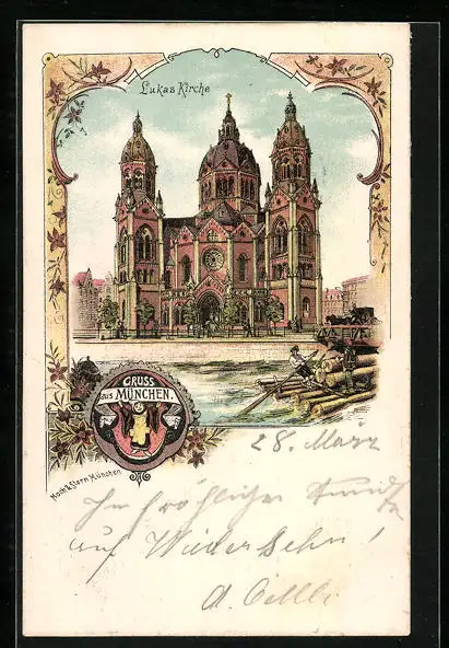 Lithographie München, Lukas Kirche, Münchner Kindl, Trockenblumen