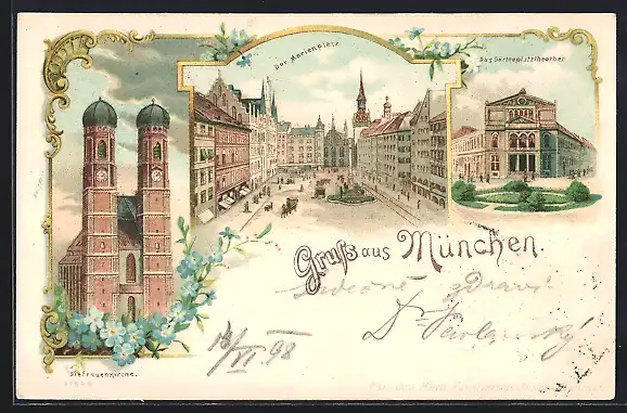 Lithographie München, Marienplatz, Gärtnerplatztheater, Frauenkirche