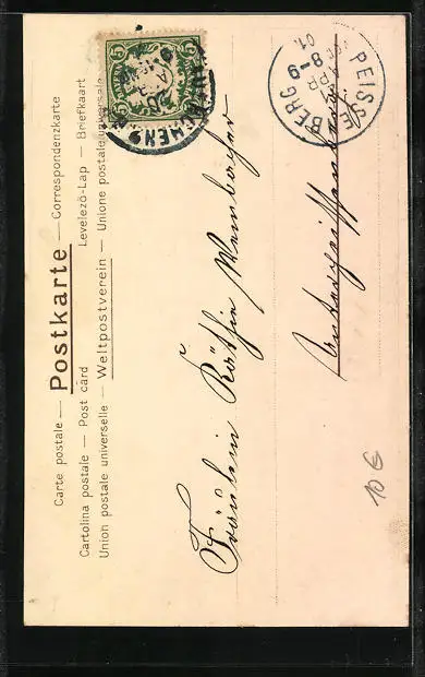 Personenbezogene Daten auf der Rückseite der Karte wurden durch blauen Textmarker unkenntlich gemacht. Die blauen Stellen sind auf die Vorderseite durchgeweicht und wirken sich negativ auf das Postkartenfoto aus