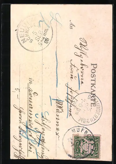 Personenbezogene Daten auf der Rückseite der Karte wurden durch blauen Textmarker unkenntlich gemacht. Die blauen Stellen sind auf die Vorderseite durchgeweicht und wirken sich negativ auf das Postkartenfoto aus