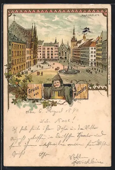 Lithographie München, Marienplatz mit Denkmal