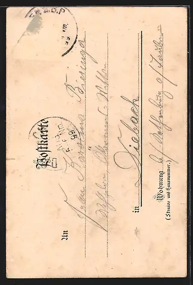 Personenbezogene Daten auf der Rückseite der Karte wurden durch blauen Textmarker unkenntlich gemacht. Die blauen Stellen sind auf die Vorderseite durchgeweicht und wirken sich negativ auf das Postkartenfoto aus