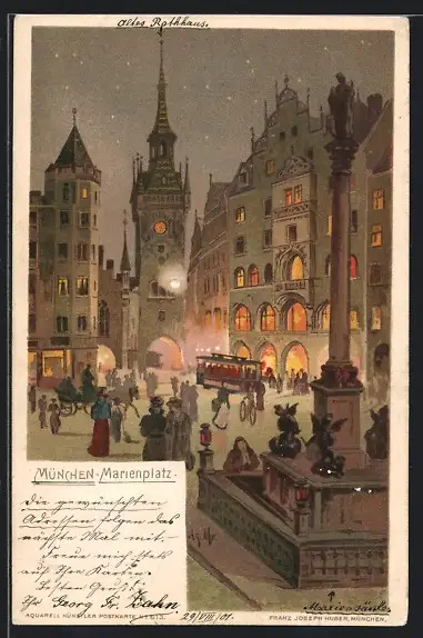 Lithographie München, Marienplatz mit Strassenbahn bei Nacht