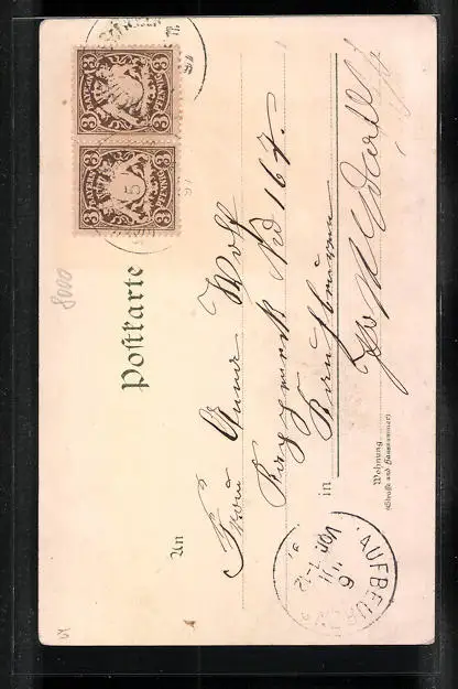 Personenbezogene Daten auf der Rückseite der Karte wurden durch blauen Textmarker unkenntlich gemacht. Die blauen Stellen sind auf die Vorderseite durchgeweicht und wirken sich negativ auf das Postkartenfoto aus