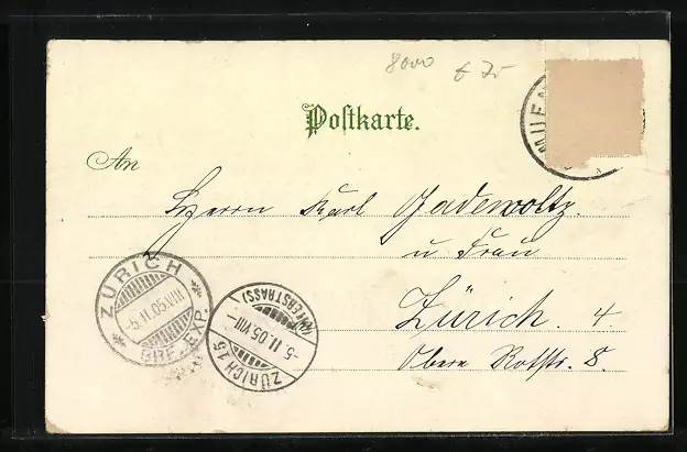 gelaufen 1905, Briefmarke entfernt, rückseitig Oberflächenschaden, guter Zustand