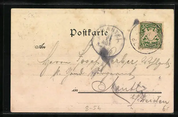 Personenbezogene Daten auf der Rückseite der Karte wurden durch blauen Textmarker unkenntlich gemacht. Die blauen Stellen sind auf die Vorderseite durchgeweicht und wirken sich negativ auf das Postkartenfoto aus
