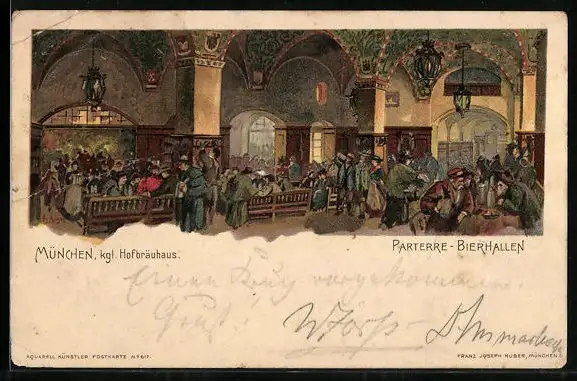 Lithographie München, Münchner Hofbräuhaus, Parterre Bierhallen, Innenansicht