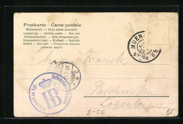 Personenbezogene Daten auf der Rückseite der Karte wurden durch blauen Textmarker unkenntlich gemacht. Die blauen Stellen sind auf die Vorderseite durchgeweicht und wirken sich negativ auf das Postkartenfoto aus