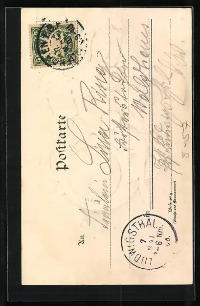 Personenbezogene Daten auf der Rückseite der Karte wurden durch blauen Textmarker unkenntlich gemacht. Die blauen Stellen sind auf die Vorderseite durchgeweicht und wirken sich negativ auf das Postkartenfoto aus