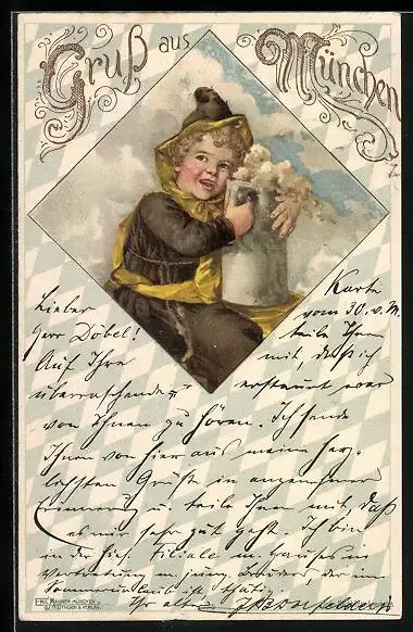 Lithographie München, Münchner Kindl mit grossem Bierkrug