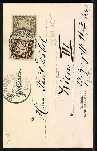 Personenbezogene Daten auf der Rückseite der Karte wurden durch blauen Textmarker unkenntlich gemacht. Die blauen Stellen sind auf die Vorderseite durchgeweicht und wirken sich negativ auf das Postkartenfoto aus