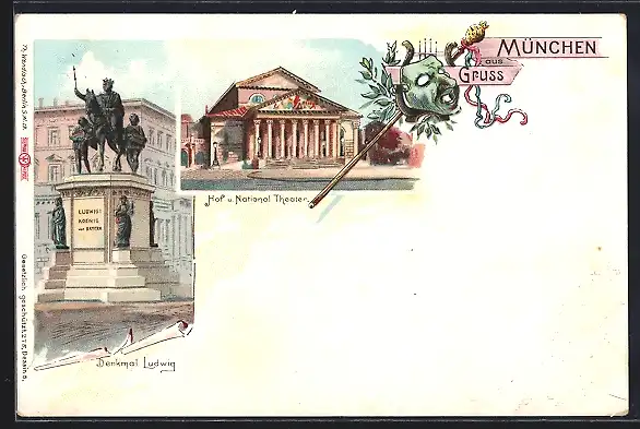 Lithographie München, Nationaltheater, Denkmal König Ludwig - Reiterstandbild