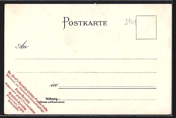 Personenbezogene Daten auf der Rückseite der Karte wurden durch blauen Textmarker unkenntlich gemacht. Die blauen Stellen sind auf die Vorderseite durchgeweicht und wirken sich negativ auf das Postkartenfoto aus