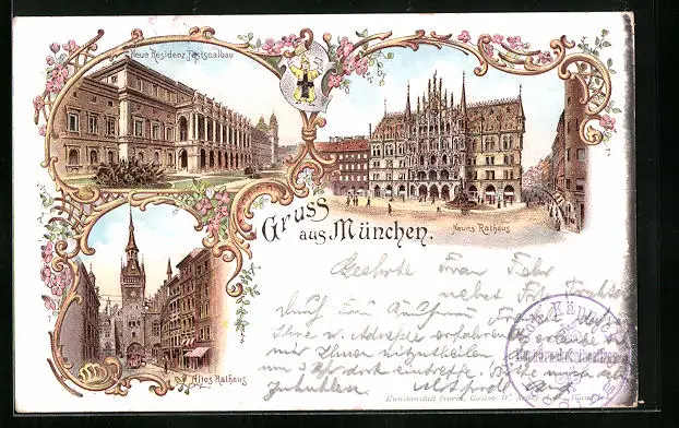 Lithographie München, Neue Residenz. Festsaalbau, Neues und altes Rathaus