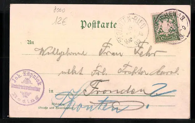 Personenbezogene Daten auf der Rückseite der Karte wurden durch blauen Textmarker unkenntlich gemacht. Die blauen Stellen sind auf die Vorderseite durchgeweicht und wirken sich negativ auf das Postkartenfoto aus