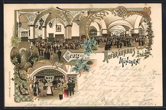 Lithographie München, Neues Hofbräuhaus, Gäste im Festsaal, Bierkrug