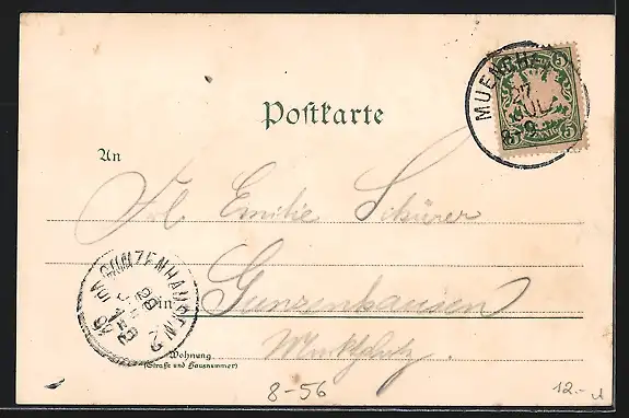 Personenbezogene Daten auf der Rückseite der Karte wurden durch blauen Textmarker unkenntlich gemacht. Die blauen Stellen sind auf die Vorderseite durchgeweicht und wirken sich negativ auf das Postkartenfoto aus