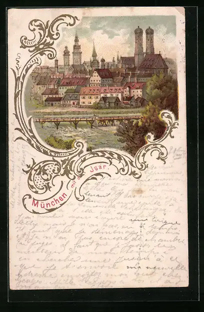 Lithographie München, Ortsansicht mit der Isar