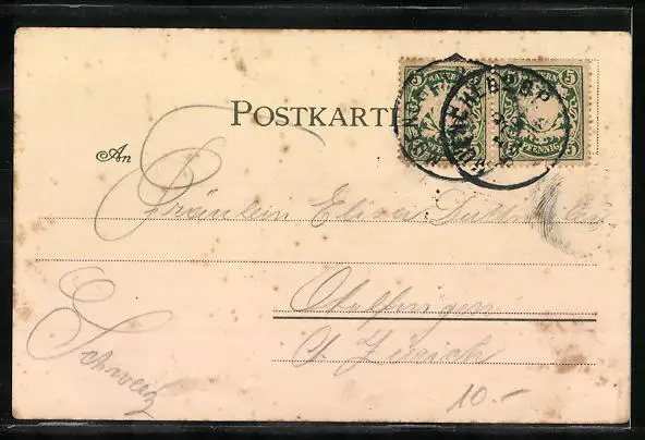 Personenbezogene Daten auf der Rückseite der Karte wurden durch blauen Textmarker unkenntlich gemacht. Die blauen Stellen sind auf die Vorderseite durchgeweicht und wirken sich negativ auf das Postkartenfoto aus
