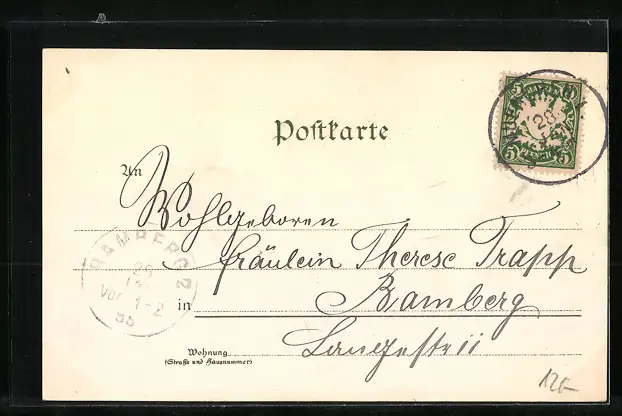 Personenbezogene Daten auf der Rückseite der Karte wurden durch blauen Textmarker unkenntlich gemacht. Die blauen Stellen sind auf die Vorderseite durchgeweicht und wirken sich negativ auf das Postkartenfoto aus