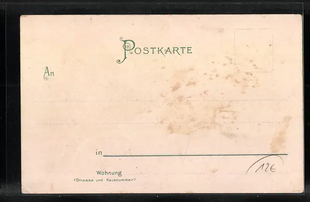 Personenbezogene Daten auf der Rückseite der Karte wurden durch blauen Textmarker unkenntlich gemacht. Die blauen Stellen sind auf die Vorderseite durchgeweicht und wirken sich negativ auf das Postkartenfoto aus
